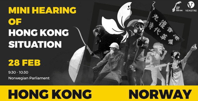 Den 28. februar arrangerte Venstre ved stortingsrepresentant Guri Melby en mini-høring i Stortinget om situasjonen i Hongkong. Høringen ble sanntidsstrømmet, og opptaket er fortsatt tilgjengelig (hopp til 06:15 for å gå til starten på møtet). Flere norske politikere deltok, så vel politiske rådgivere som Stortingsrepresentanter. Medarrangør Hongkongkomitéen i Norge var selvfølgelig til stede sammen med mange andre frivillige organisasjoner, som Den norske Tibetkomité, Den Norske Uighurkomitéen, Amnesty Norge, og Den Nordiske Menneskerettighetskomitéen.