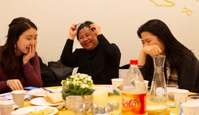Før ostekaken var det tid for mitt hovedbidrag: quiz! («Sidebidraget» mitt var beskjedent, av typen gulrotskrelling, oppskjæring av paprika o.l.) Det viste seg at jeg hadde like lite kontroll på begivenhetene som det som vanlig er: min oppfordring om å gå sammen to-og-to i lag fikk ikke fullt gjennomslag; flere lag valgte for sikkerhets skyld (eller kanskje for samholdets skyld?) å være tre. Avbildet er laget med utvekslingsstudenter fra Hongkong og en representant for Voice. Det var naturligvis utmerket med tre på lag, men med en potensiell risiko for krøll i den avsluttende premieutdelingen.