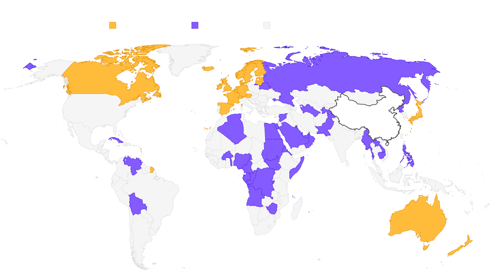 Med utgangspunkt i de voldsomme reaksjonene som har funnet sted i muslimske land når islam kritiseres i vestlige land, burde man forvente en unison og høyrøstet fordømmelse av tvangsassimileringen i Øst-Turkestan. Men det er det motsatte som har skjedd: Da overgrepen i Øst-Turkestan ble tatt opp i FN-systemet i juli i fjor, var reaksjonen fra samtlige muslimske land som uttalte seg en tilslutning til en tekst som støttet Kina, blant annet fordi regionen nå hadde “a stronger sense of happiness”. Lite viser tydeligere omfanget og effektiviteten av Beijings verdensomspennende bruk av økonomisk press enn dette. (Stemmegivningen er fargemarkert på kartet til høyre.)