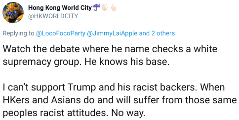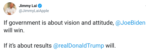 Avisens eier, den profilerte pro-demokraten Jimmy Lai, har en noe mindre balansert syn på kandidatene; det er åpenbart at han foretrekker gjenvalg av Trump. I twitter-meldingen gjengitt her, påstår han implisitt at Trump har gode resultater å vise til. Om dette er ment som en generell påstand, er den selvfølgelig hårreisende, nå (25. oktober) er 225.000 døde i USA på grunn av Trump og hans administrasjons elendige håndtering av pandemien. Kanskje “resultatene” Jimmy Lai tenkte på var begrenset til sanksjonene av de 11 tjenestemennene i Hongkong? Men dette fulgte som en konsekvens av tverrpolitiske vedtak i kongressen.