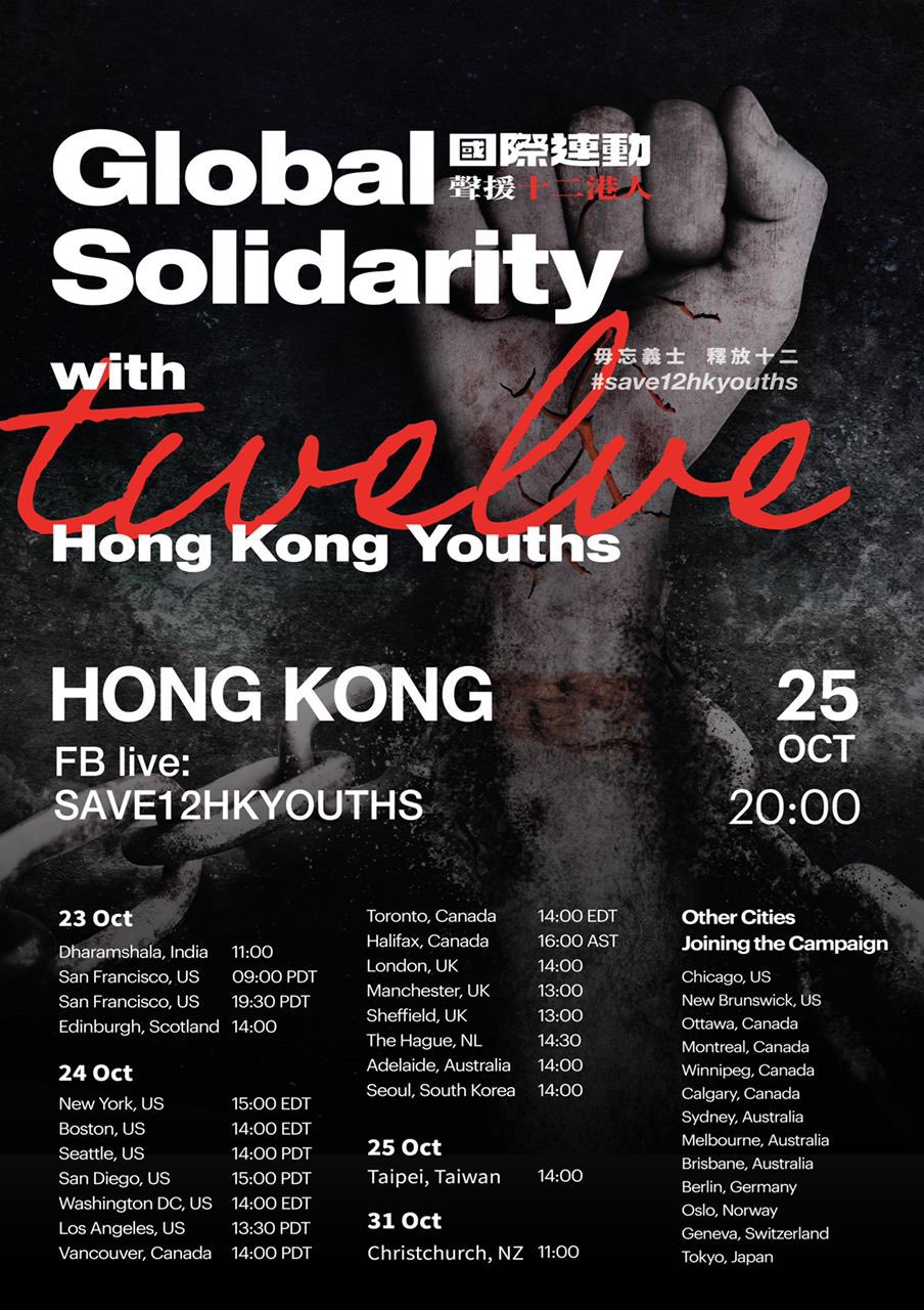 I september holdt fortvilte familier en pressekonferanse og under et Facebook Live-arrangement den 25. oktober ble flere familiemedlemmer intervjuet. Engasjementet for skjebnen til de 12 unge hongkongerne er en av flere saker som sørger for en kontinuerlig belysning av den dramatiske forverringen av menneskerettighetssituasjonen i Hongkong. Fotografiet viser en solidaritetsmarkering i Hongkong; teksten som er skrevet på plakatene lyder i en grov oversettelse “Be til Gud om at kinesisk kommunisme tilintetgjøres slik at de 12 kan komme trygt tilbake til oss”.