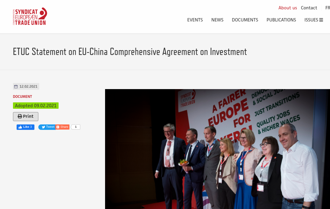 I februar kom den største fagforeningssammenslutningen i Europa (The European Trade Union Confederation, ETUC) med en svært kritisk uttalelse om CAI. ETUC presenterte elleve krav til CAI om endringer og tillegg. For eksempel kreves det i det første kulepunktet at også ratifisering av ILO-konvensjonene 87 og 98 om henholdsvis organisasjonsfrihet og forhandlingsrett må legges inn i CAI. LO, YS og UNIO er alle blant ETUCs medlemsorganisasjoner.