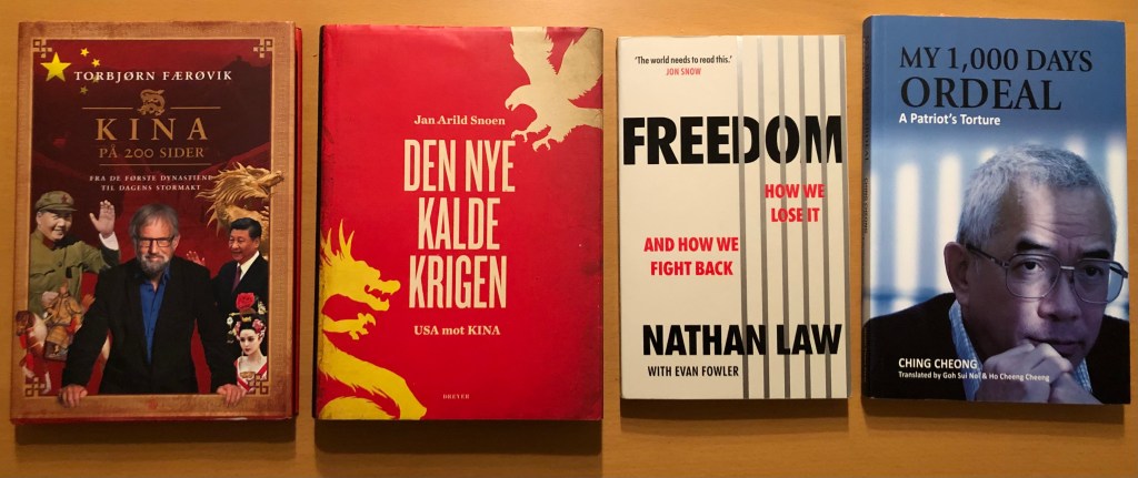 Det siste kan jo være fordi det ikke passet inn i intervju-settingen. La meg anbefale noen bøker: For det lange perspektivet, les Torbjørn Færøviks “Kina på 200 sider”. Og for nyere historie, les Jan Arild Snoens “Den nye kalde krigen”. Med tanke på den rådende situasjonen i verden, anbefaler jeg varmt å supplere med Nathan Laws “Freedom: How we lose it, and how we fight back”. Om kunnskapstørsten fortsatt ikke er stillet, så les korrespondent Ching Cheongs “My 1,000 days ordeal” om torturen han ble utsatt for i Kinas svarte fengsler, eller plukk ut noen av tekstene fra Snoens 50 tettskrevne sider med referanser.