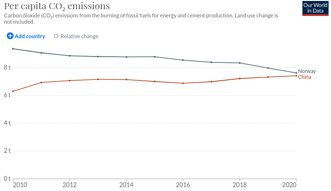 Når det gjelder utslipp i lufta av lokalforurensning har situasjonen bedret seg betydelig i senere år. Likevel er det seneste årsmidlede forurensningsnlvået av små partikler (PM2.5) i Beijing (40ppm) godt innenfor intervallet som defineres som rødt nivå i Norge: en høy forurensningsgrad med en betydelig helserisiko.Når det gjelder utslipp av klimagassen CO2 sier Solheim til Nettavisen at “Vi nordmenn slipper også ut veldig mye mer per innbygger enn […] Kina”. Dette er reinspikka løgn. Tallmaterialet fra Our World in Data viser at utslipp per innbygger i Norge og i Kina er så og si identisk (se figur under).