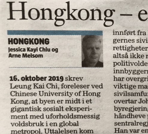 16 oktober 2019 skrev Chinese University of Hong Kong-foreleser Leung Kai Chi at byen er midt i et gigantisk sosialt eksperiment med uforholdsmessig voldsbruk i en global metropol. Uttalelsen kom etter at en meningsmåling viste at mer enn 70% av Hongkongs befolkning hadde mistet tillit til politiet.