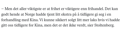 I et større intervju med Dagens Næringsliv uttalte NATOs generalsekretær nylig at “frihet er viktigere enn frihandel. Det kan godt hende at Norge hadde tjent litt ekstra på å tidligere gi seg i en forhandling med Kina.”