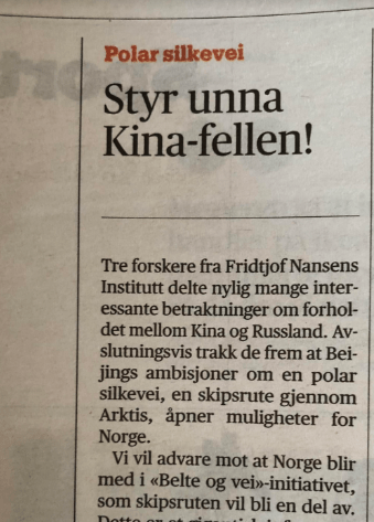 Tre forskere fra Fridtjof Nansens Institutt delte nylig mange interessante betraktninger om forholdet mellom Kina og Russland. Avslutningsvis trakk de frem at Beijings ambisjoner om en polar silkevei, en skipsrute gjennom Arktis, åpner muligheter for Norge.