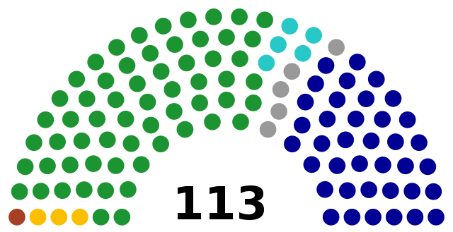 Dagens fordeling av representanter er gjengitt på figuren til høyre. Den er: DPP (grønt): 61; KMT (blått): 38; Taiwan People’s Party (TPP; cyan): 5; uavhengige (grå): 5; andre: 4). For å få flertall må et parti eller et samarbeid kontrollere 57 seter.