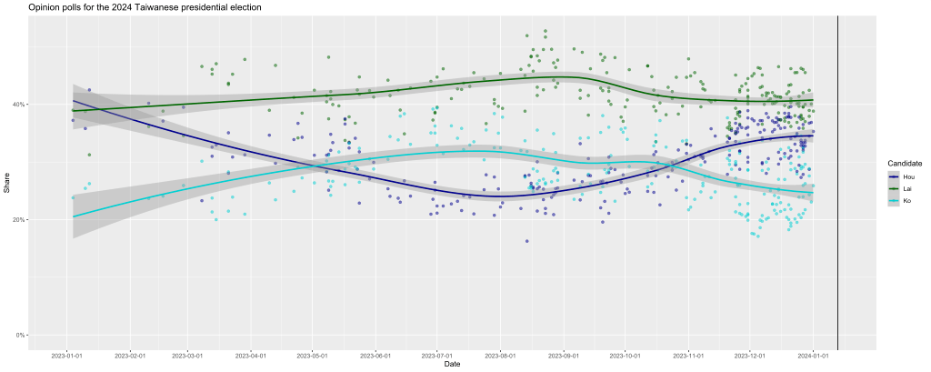 Fallet til Ko på meningsmålingene gir en ekstra usikkerhet: Når hans velgere ser at han neppe vil vinne, vil de fortsatt stemme på TPP i presidentvalget? Hvis ikke, hvor vil de gå? I høst sonderte lenge Hou og Ko muligheten for å stille sammen i et tverrpolitisk samarbeid. Dette initiativet falt i fisk, men det kan jo likevel indikere at KMT og Hou har størst potensiale til å øke oppslutningen med stemmer fra desillusjonerte Ko-tilhengere. Vi får ikke vite mer før opptellingen av stemmer begynner, for det er forbud mot å offentliggjøre meningsmålinger de siste ti dagene før valget.