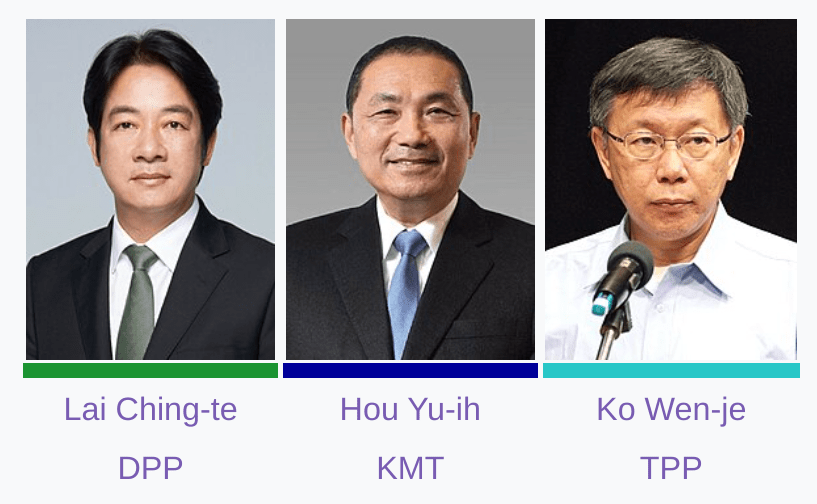 Det er tre presidentkandidater i årets valg: Lai Ching-te (DPP; nå: visepresident); Hou Yu-ih (KMT; nå: borgermester i New Taipei); Ko Wen-je (TPP; nå: partileder).