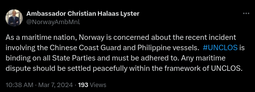 Jeg har blitt gjort oppmerksom på at Norges ambassadør til Filippinene, Christian Halaas Lyster, den 7. mars la ut posten til høyre på X/Twitter. Dette viser til hendelsen 5. mars som jeg omtaler over, og innebærer et lite steg i positiv retning. Men jeg mener at denne uttalelsen er altfor lite spesifikk.