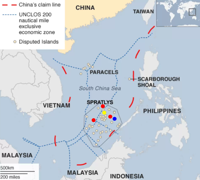 Som et svar på at Folkerepublikken okkuperer Mischiefrevet (rød sirkel lengst mot øst), valgte Fillipinene bevisst å grunnstøtte det 100-meter lange landingsfartøyet Sierra Madre ved atollen Second Thomas Shoal (markert med blå sirkel), godt innenfor landets 200-milssone. Det er til enhver tid om lag 10 personer fra Filippinenes marine om bord på det grunnstøtte skipet.
