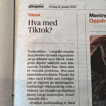 Fredag 24. januar publiserte Aftenposten en kronikk av Sina Storelv om sosiale mediers rolle generelt, og TikTok spesielt. Utviklingen er bekymringsfull. Særlig gjelder dette Elon Musks nye rolle i politikken, koblet med hans eierskap og profil på X (Twitter). Nye oppkjøp kan føre til en uheldig økt konsentrasjon av makt.