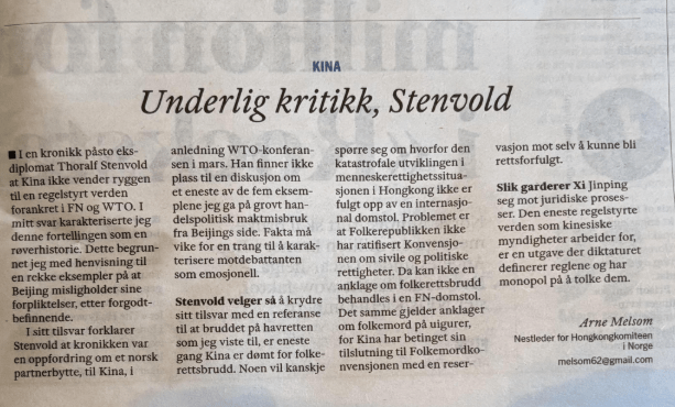 Stenvold velger så å krydre sitt tilsvar med en referanse til at bruddet på havretten som jeg viste til, er eneste gang Kina er dømt for folkerettsbrudd. Noen vil kanskje spørre seg om hvorfor den katastrofale utviklingen i menneskerettighetssituasjonen i Hongkong ikke er fulgt opp av en internasjonal domstol. Problemet er at Folkerepublikken ikke har ratifisert Konvensjonen om sivile og politiske rettigheter. Da kan ikke en anklage om folkerettsbrudd behandles i en FN-domstol. Det samme gjelder anklager om folkemord på uighurer, for Kina har betinget sin tilslutning til Folkemordkonvensjonen med en reservasjon mot selv å kunne bli rettsforfulgt.