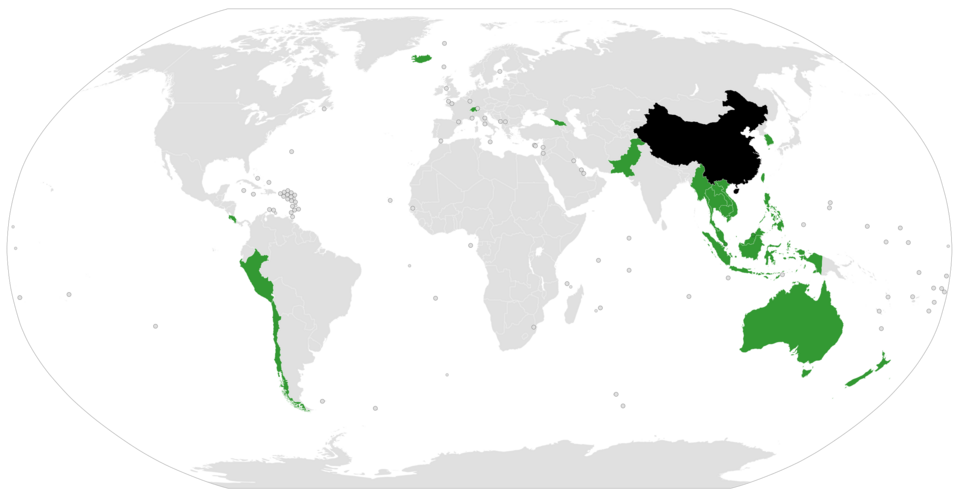 Et av landene som Kina har en frihandelsavtale med, er Australia (i 2015; se illustrasjon som viser frihandelspartnere). Da Australia utelukket kinesiske leverandører fra 5G-utbyggingen i 2018, surnet relasjonene. Utestengelsen ble begrunnet med trusler mot nasjonal sikkerhet.