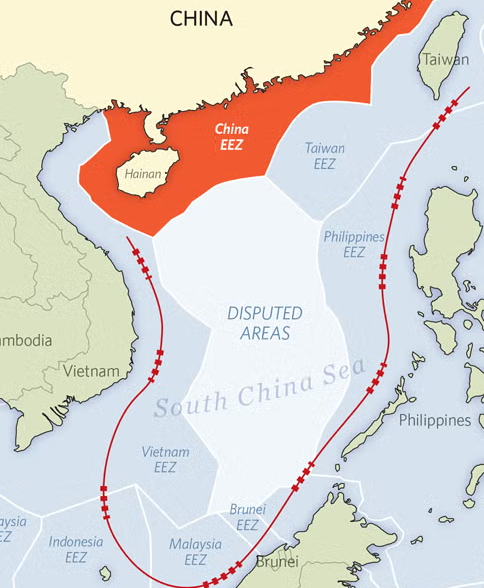 Den maritime grenseoppgangen i Sør-Kina-havet er omstridt, og involverer mange stater. Kina står bak det suverent mest aggressive kravet, som ofte omtales som den ni-stiplede linjen. Denne er gjengitt på kartutsnittet til høyre, der kinesiske myndigheters legitime krav på økonomisk sone er angitt i oransje.